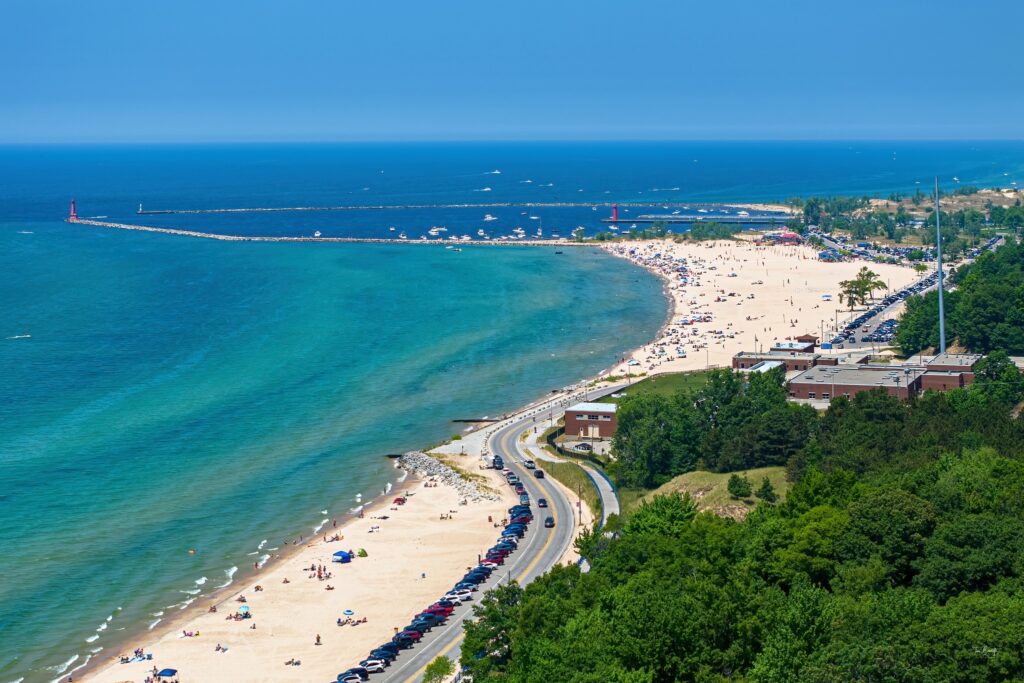 Pere Marquette Beach in Muskegon, Michigan is a wide, sandy Lake Michigan beach known for its beautiful shoreline, a public pier, dunes, and incredible sunsets. With open views and natural scenery, it’s a perfect spot for beach photos.